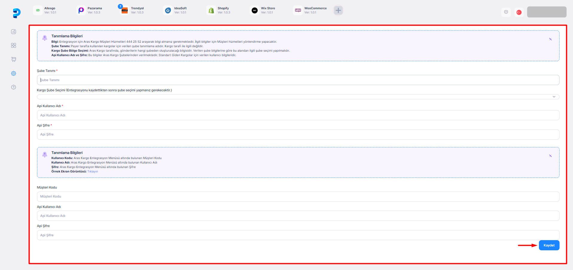 Açılan sayfada Şube Tanımı alanı Payer tarafta kullanılan kargolar için verilen şube tanımlama adıdır. Kargo tarafı ile ilgili değildir. Şube tanımı alanı doldurulur. API Kullanıcı Adı ve API Şifre alanına Aras Kargo şubelerinden alınan API kullanıcı adı ve şifre bilgisi yazılır.