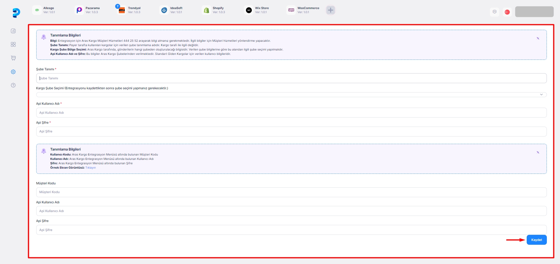 Müşteri Kodu alanına Aras Kargo Entegrasyon Menüsü altında bulunan Müşteri Kodu bilgisi yazılır. API Kullanıcı Adı alanına Aras Kargo Entegrasyon Menüsü altında bulunan Kullanıcı Adı bilgisi yazılır. API Şifre alanına Aras Kargo Entegrasyon Menüsü altında bulunan Şifre bilgisi yazılır.