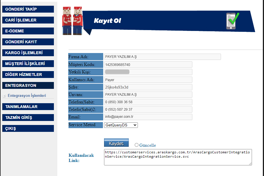 Aras Kargo entegrasyonu için 444 25 52 aranarak bilgi alınması gereklidir. Entegrasyon ile ilgili bilgiler için Müşteri Hizmetleri yönlendirme yapacaktır.