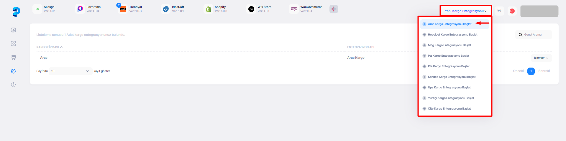 Aras Kargo entegrasyonu başlatmak için sol menüden Tanımlamalar > Kargo Entegrasyonları butonuna tıklanır. Açılan sayfada sağ üst kısımda bulunan Yeni Kargo Entegrasyonu butonu altında Aras Kargo Entegrasyonu Başlat butonuna tıklanır.