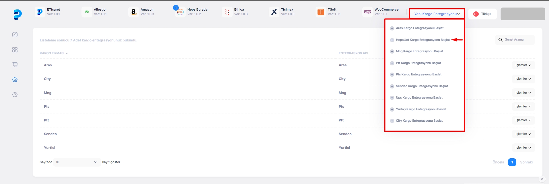 HepsiJet Kargo entegrasyonu ekranı için sol menüden Tanımlamalar > Kargo Entegrasyonları butonuna tıklanır. Açılan sayfada sağ üst kısımda bulunan Yeni Kargo Entegrasyonu butonu altında HepsiJet Kargo Entegrasyonu Başlat butonuna tıklanır.