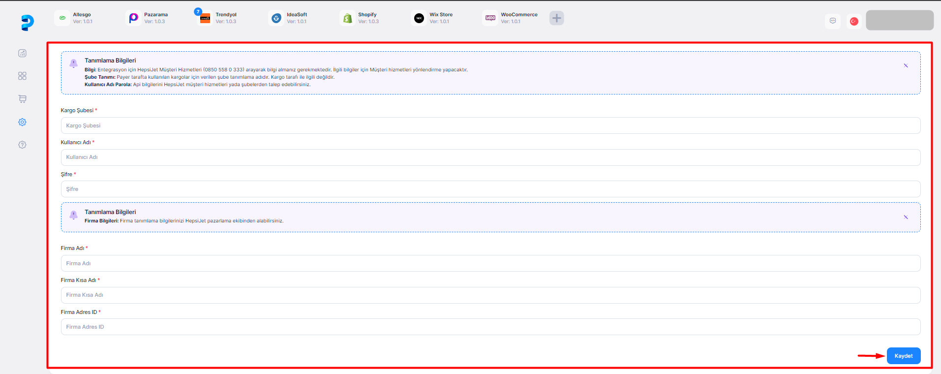 Kargo Şubesi, Firma Kısa Adı ve Firma Adres ID alanları HepsiJet pazarlama ekibinden alınmalıdır.