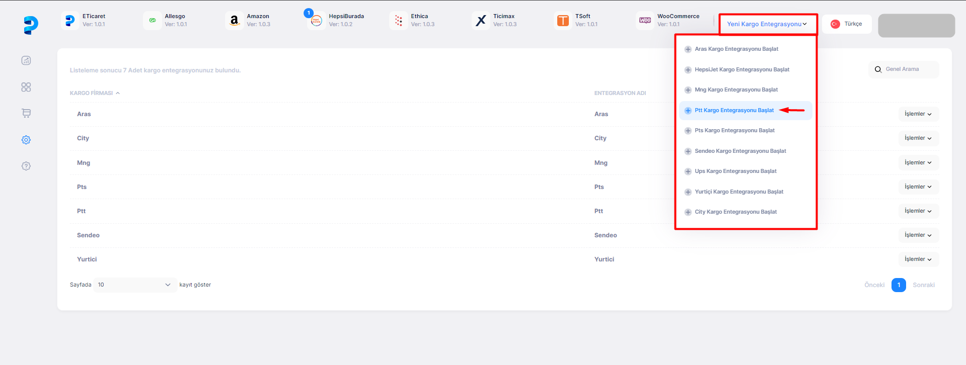 Ptt Kargo entegrasyonu ekranı için sol menüden Tanımlamalar > Kargo Entegrasyonları butonuna tıklanır. Açılan sayfada sağ üst kısımda bulunan Yeni Kargo Entegrasyonu butonu altında Ptt Kargo Entegrasyonu Başlat butonuna tıklanır.