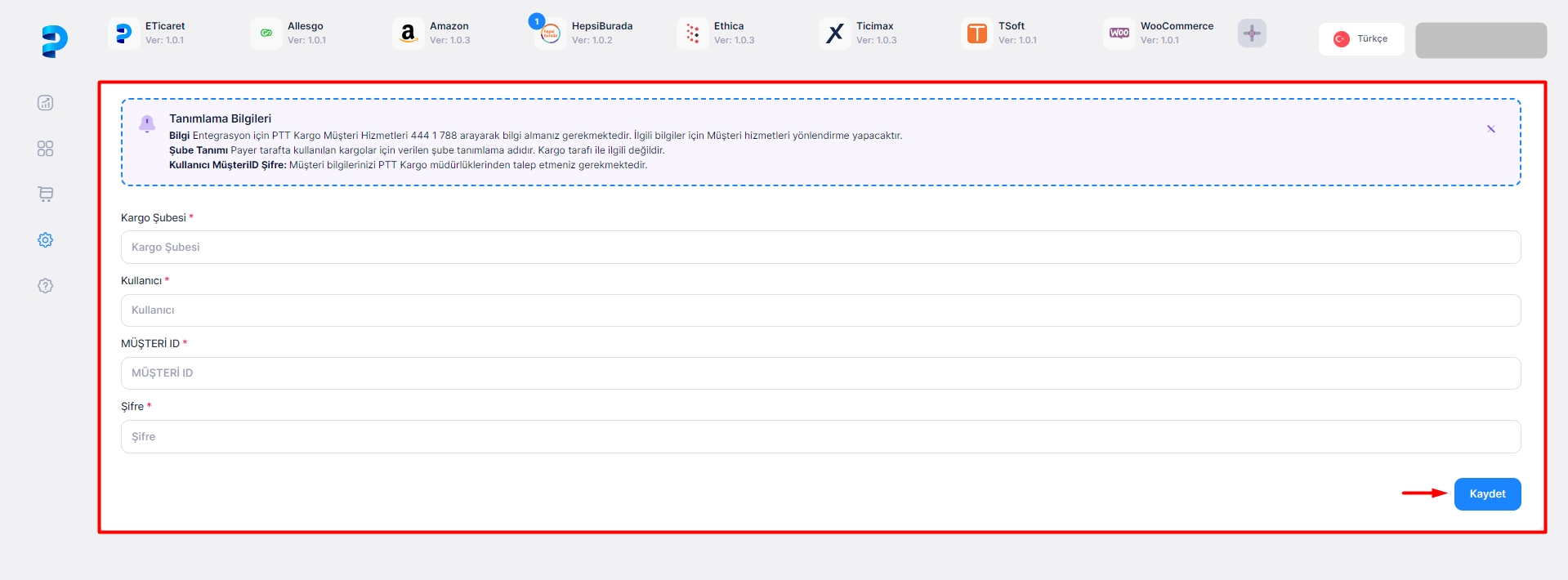 Ptt Kargo entegrasyonu için 444 1 788 aranarak bilgi alınması gereklidir. Entegrasyon ile ilgili bilgiler için Müşteri Hizmetleri yönlendirme yapacaktır.