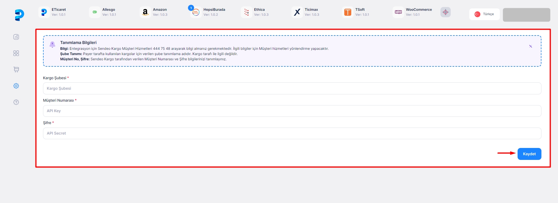 Tanımlamalar yapıldıktan sonra Kaydet butonuna tıklanarak entegrasyon kaydetme işlemi tamamlanır.