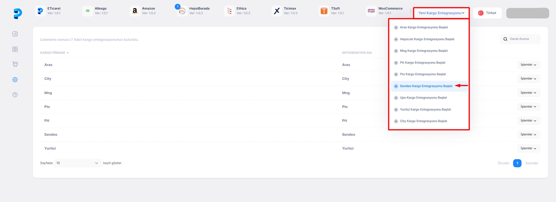 Sendeo Kargo entegrasyonu için 444 75 48 aranarak bilgi alınması gereklidir. Entegrasyon ile ilgili bilgiler için Müşteri Hizmetleri yönlendirme yapacaktır.