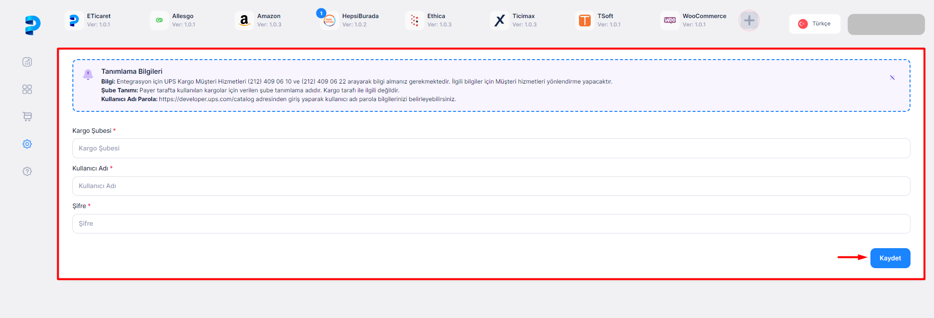 Açılan sayfada Kargo Şubesi alanı Payer tarafta kullanılan kargolar için verilen şube tanımlama adıdır. Kargo tarafı ile ilgili değildir. Kargo Şubesi alanı doldurulur. Kullanıcı Adı ve Şifre alanları için https://developer.ups.com/catalog adresinden giriş yaparak Kullanıcı Adı ve Parola bilgileri belirlenir ve bu alanlar doldurulur.
