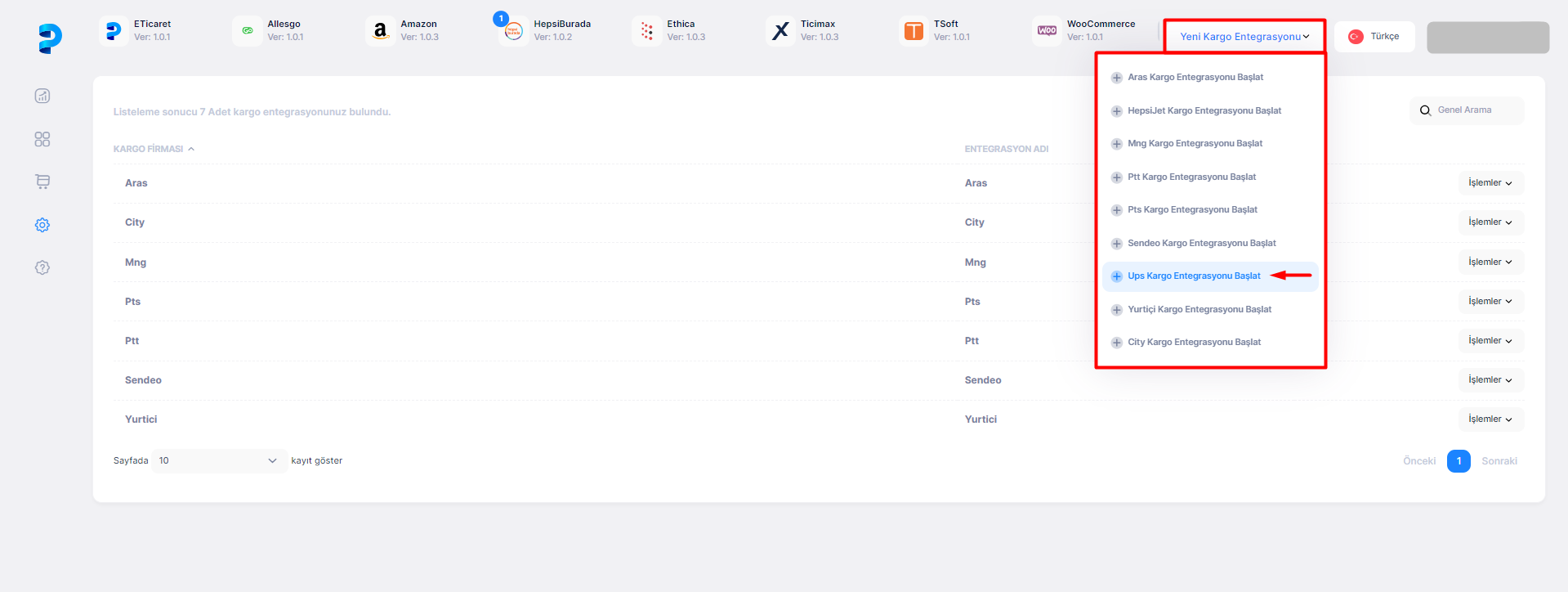 Ups Kargo entegrasyonu ekranı için sol menüden Tanımlamalar > Kargo Entegrasyonları butonuna tıklanır. Açılan sayfada sağ üst kısımda bulunan Yeni Kargo Entegrasyonu butonu altında Ups Kargo Entegrasyonu Başlat butonuna tıklanır.