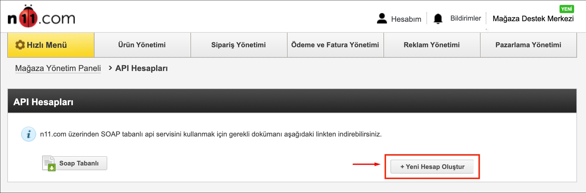 Açılan ekranda Yeni Hesap Oluştur butonuna tıklanır. Bu işlemin sonucunda API hesap bilgileri n11.com satıcı paneli üzerinde kayıtlı olan e-mail adresine mail yoluyla iletilir.