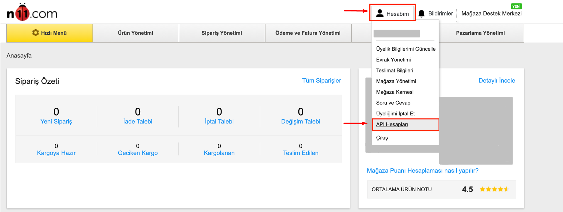 N11 API bilgisi almak için https://so.n11.com üzerinden mağaza paneline giriş yapılır. Sağ üst köşede bulunan Hesabım menüsünden API Hesapları sekmesine tıklanır.
