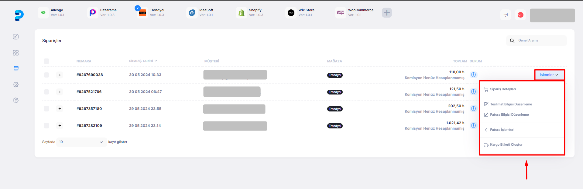 Açılan ekranda entegrasyon yapılmış tüm pazaryerlerine gelen siparişler görüntülenir. Genel Arama alanından sipariş numarası, müşteri, mağaza ile filtreleme ve arama yapılabilir.