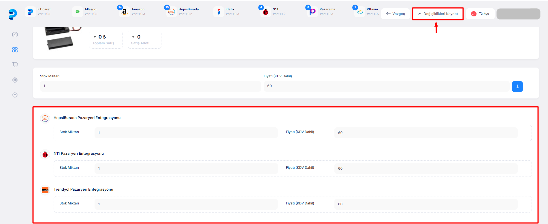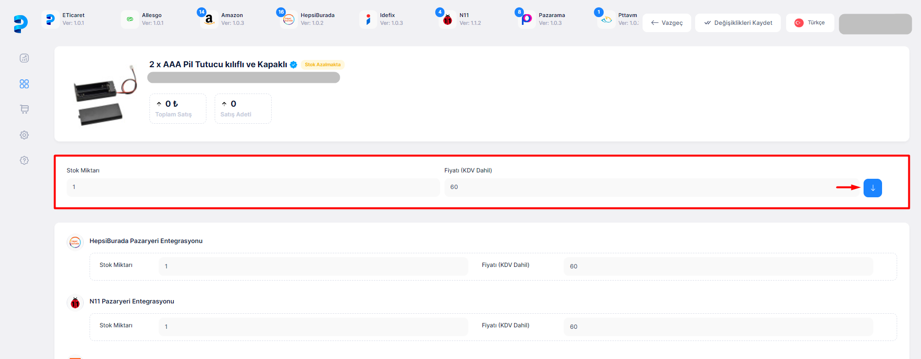 Bu sayfa içerisinden ürün stok ve fiyat bilgileri tüm pazaryerleri için düzenlenebilir. Sayfanın sağ tarafında bulunan aşağı yönlü mavi > butona tıklanarak ilgili düzenleme tüm pazaryerlerine uygulanabilir.