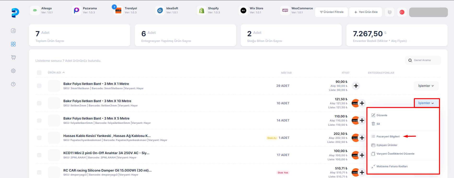 Ürün satırında entegrasyon listesi yanında bulunan + butonuna tıklanarak ürünü diğer platformlarda yayına çıkarma işlemi gerçekleştirilebilir.