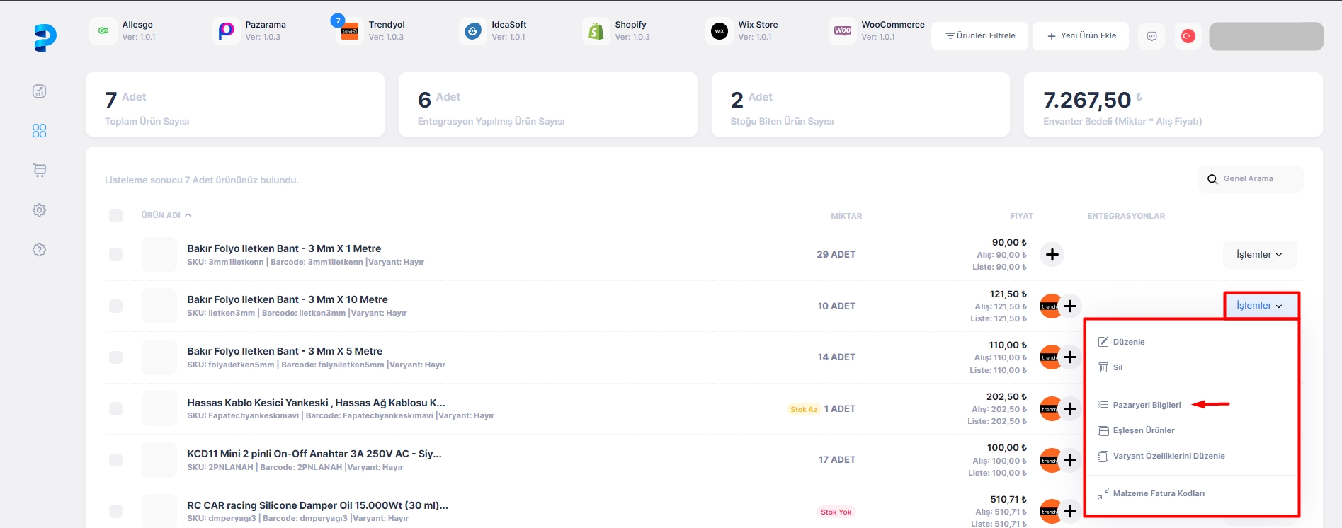 Ürün satırında İşlemler butonu altında Pazaryeri Bilgileri butonuna tıklanarak pazaryeri bazlı stok ayrıştırma işlemleri gerçekleştirilebilir.